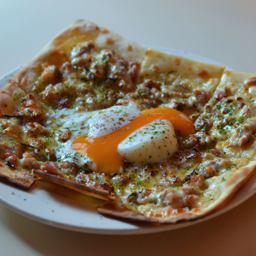 肉好きな人にこそ食べて欲しい、ほどよい塩味と肉のウマ味を引き立てたシンプルなのに食べ応えのあるシナモ式ピザです。 肉汁がたまらん!